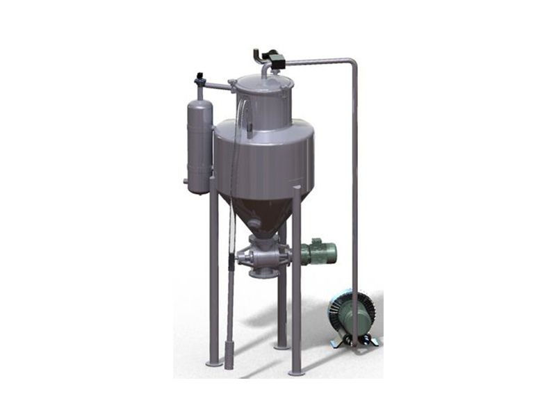 真空上料機(jī)由真空泵(無(wú)油、無(wú)水)、覆膜濾袋過濾器、壓縮空氣反吹裝置、氣動(dòng)放料門裝置、真空料斗和不銹鋼可調(diào)吸料槍、輸送軟管等部件組成。